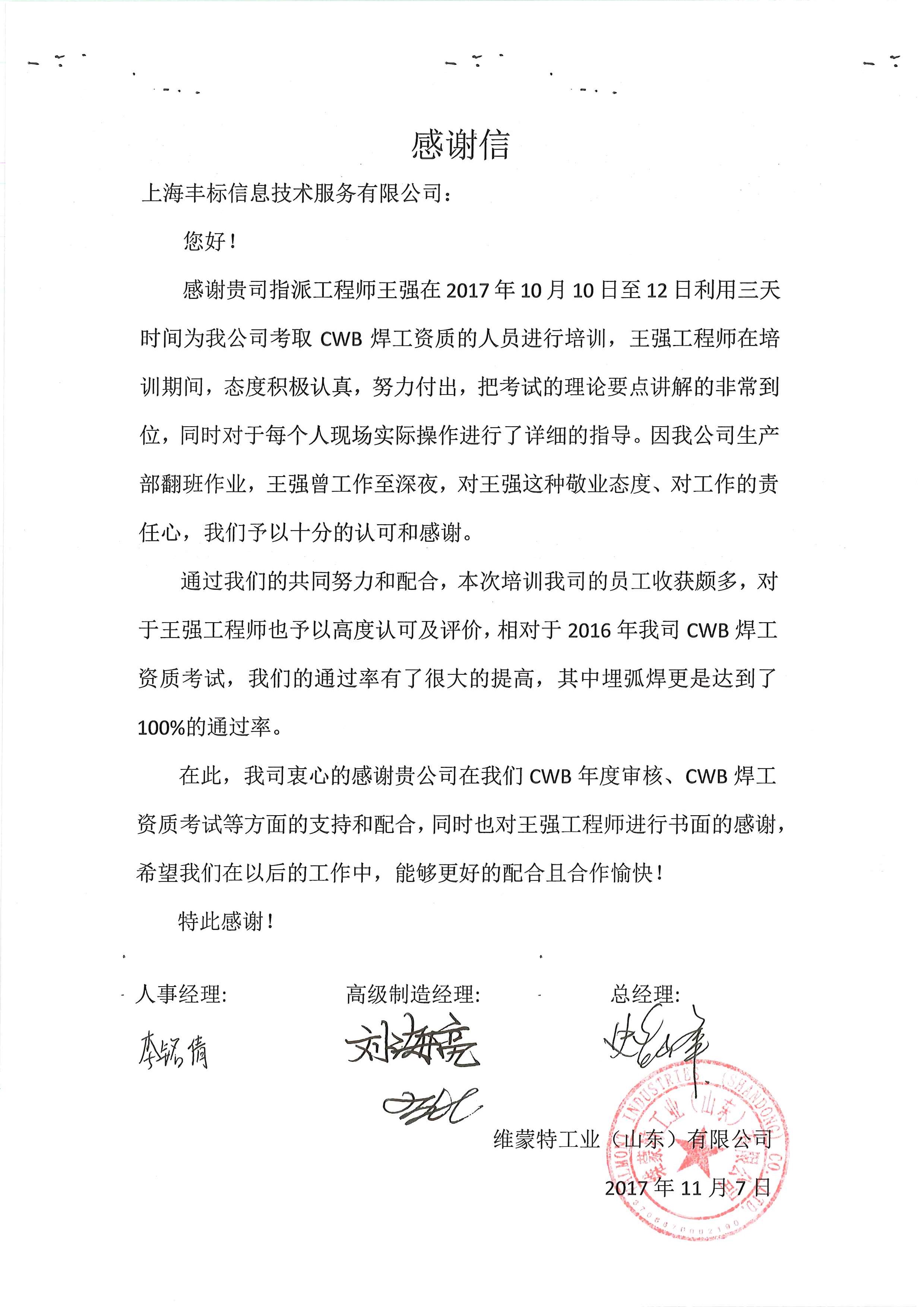 近日,上海豐標(biāo)收到維蒙特工業(yè)(山東)有限公司發(fā)來(lái)的感謝信,高度贊揚(yáng)了我司項(xiàng)目部工程師敬業(yè)的服務(wù)態(tài)度,過(guò)硬的專業(yè)能力。