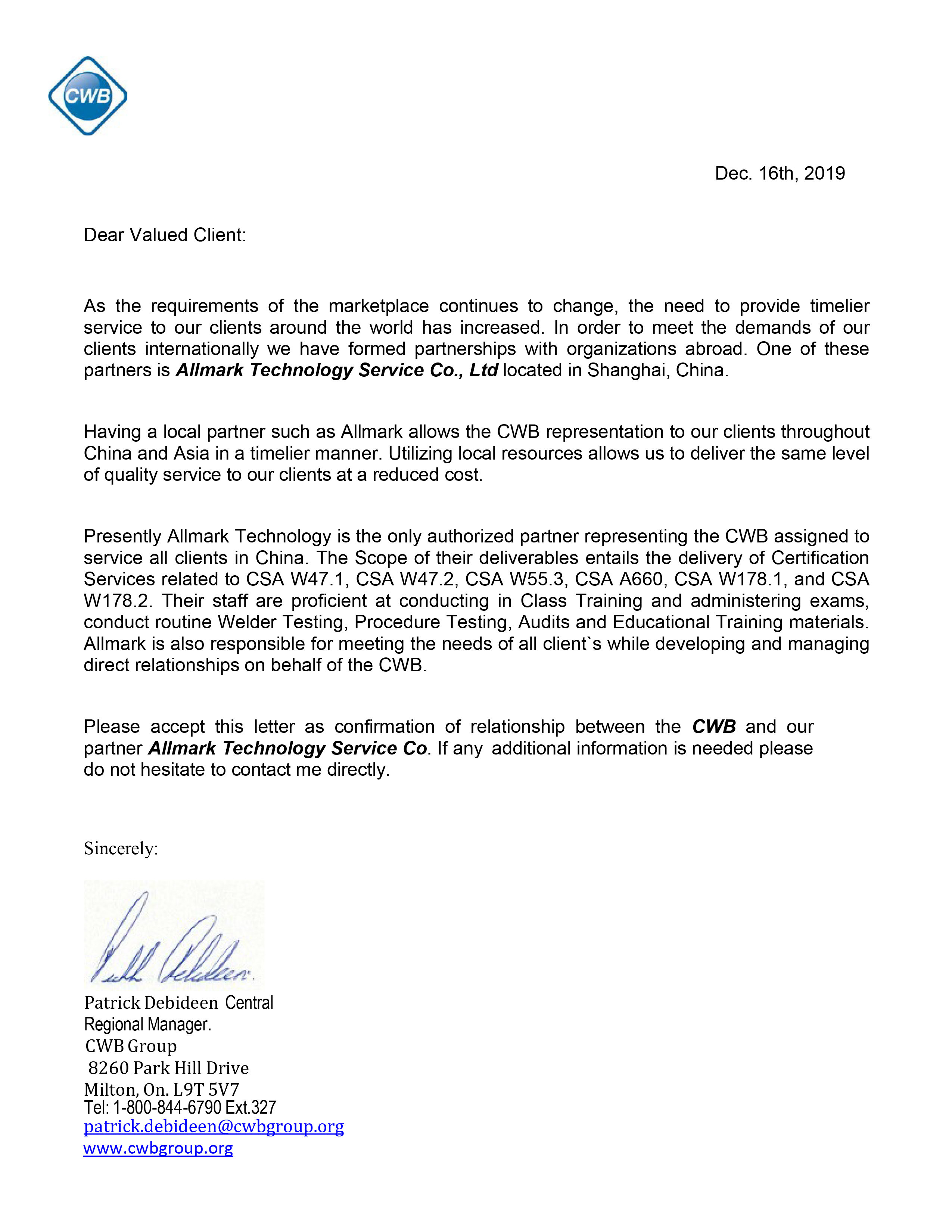 作為CWB 唯 一 授權(quán)的中國合作伙伴,上海豐標(biāo)ALLMARK代表CWB在中國服務(wù)于所有的中國客戶。他們的可滿足認(rèn)證服務(wù)的范圍涉及CSA W47.1、CSA W47.2、CSA W55.3、CSA A660、CSA W178.1和CSA W178.2等。同時,上海豐標(biāo)ALLMARK精通于為客戶提供多種專業(yè)培訓(xùn)和考試服務(wù),例如常規(guī)焊工考試,工藝評定,認(rèn)證審核和教育培訓(xùn)課程資料等。 上海豐標(biāo)ALLMARK也負(fù)責(zé)滿足所有的客戶需求的同時,代表CWB發(fā)展和經(jīng)營與所有客戶的直接合作關(guān)系。