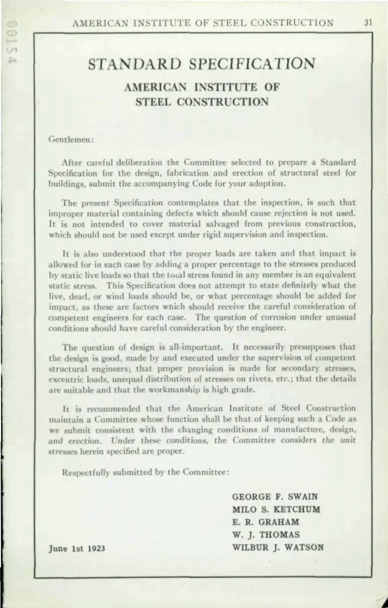1923年6月1日,AISC出版的第一份技術(shù)規(guī)范